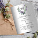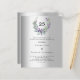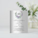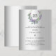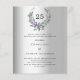 Um fundo de olhar mal prateado. Uma coroa floral feita de flores lavandas e de eucalipto verde de cor aquosa. Personalize e adicione seus nomes, detalhes. Texto preto. 1 folha = 1 convite impresso de borda a borda.