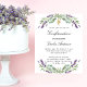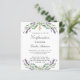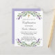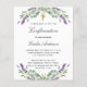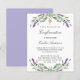 Um fundo branco decorado com flores lavandas e verde de eucalipto. Personalize e um nome e detalhes. Fundo: lavanda, fundo colorido violeta. 1 folha = 1 convite