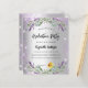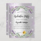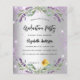 Um convite moderno e na moda. Um fundo de aparência pura prateada com brilho violeta, faíscas, flores de lavanda, flores e verde de eucalipto. Personalize e adicione o nome e os detalhes da festa.