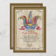 Uma máscara veneziana elegante com cores festivas e sinos é apresentada contra uma estrutura decorativa com fundo verde.