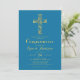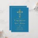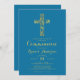 Convite moderno à comunhão azul com uma cruz dourada.Personalize com o seu texto. Verifique todos os outros itens nesta coleção de comunhão bonito para ele.