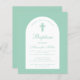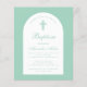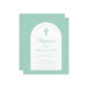 Um convite para o batismo moderno. Em um fundo verde de menta, ele tem um arco branco com dentro de texto de menta. A palavra Batismo e o nome são escritos num guião caligráfico elegante; a primeira linha é o texto arquivado.