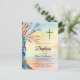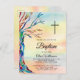 Convide familiares e amigos para o batismo do seu bebê com este convite postal único. Apresenta uma árvore genealógica nas cores do arco-íris e uma cruz num fundo de aquarela. Facilmente personalizável com seus detalhes. Este design único é um impressão de um mosaico da Árvore Familiar que foi feito de pequenos pedaços de vidro de cor clara. Porque nós criamos nosso próprio trabalho de arte você não encontrará essa imagem exata de outros designers. Mosaico original © Michele Davies.
