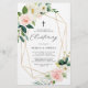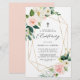 Convide familiares e amigos para o seu evento com este convite personalizável de batizar. Apresenta a cor-de-água, as flores de primavera cor-de-rosa escamosas, os acentos verdes e uma estrutura geométrica falsa de folha de ouro. Personalize este convite de batizar floral adicionando seus próprios detalhes. Este convite para batizar de aquarela é perfeito para batizados de primavera e batizados de menina.