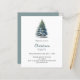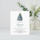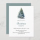 Um convite de inverno para uma festa de Natal. Um fundo branco na frente decorado com um pinheiro desenhado à mão, de cor aquosa, com neve. Personalize e adicione os detalhes da sua festa. Fundo: fundo azul-verde. 1 folha = 1 convite impresso de borda a borda.