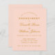 Um simples convite para festas de noivado com uma cor moderna: rosa-claro. Ele tem apenas texto de ouro sobre fundo de blush. Os nomes são escritos num script caligráfico elegante, o resto em bonés. a primeira linha é texto arquivado.