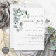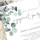 Convite para Noivado Eucalyptus Watercolor. Disponível digitalmente e impresso. Estilo botânico minimalista, com verde-aquarela no canto superior esquerdo e texto à direita. Um script manuscrito definido para a Festa de noivado e o resto do texto que você pode personalizar facilmente.