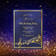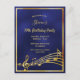 Na frente: Um cartão de convite de aniversário moderno e moderno para homens. Um fundo azul escuro, azul marinho. A cor azul é irregular. Com uma falsa imagem de ouro e notas musicais, letras coloridas de ouro. Modelos para informações sobre a sua parte. Fundo branco. Dica: Se você não quiser que pareça um cartão postal, clique em personalizar, vá para o verso e remova o divisor e o carimbo de posto.