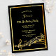 Um cartão de convite de aniversário moderno e moderno para homens e mulheres. Um fundo preto clássico, com falso quadro dourado e notas musicais, letras ouros coloridas. Modelos para informações sobre a sua parte. Fundo branco. Dica: Se você não quiser que pareça um cartão postal, clique em personalizar, vá para o verso e remova o divisor e o carimbo de posto.