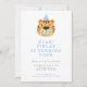 Um convite de aniversário simples mas divertido para o quarto aniversário do seu filho. Este design apresenta uma ilustração aquosa do rosto de um tigre com um chapéu azul de festa. Personalize com seu título em azul claro e detalhes da festa em cinzas escuras. No verso está um padrão de faixas diagonais azuis.