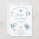 Elegante convite de aniversário para crianças em tons de azul e ouro com um tema de golfinhos doces, estrelas e águas-vivas, bem como bolhas de água. Fundo branco. Padrão de bolha azul no lado de trás.