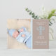 Blocos contemporâneos de cor suave realçam a foto de seus queridos bebês nesta design moderna para o batismo ou batismo do seu filho. Adorada com uma elegante cruz de azul bebê, toda a sua informação de celebração está nas costas. Também disponível: