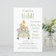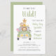 O convite para bebês, amigável em orçamento, que apresenta uma ilustração fofa de animais do zoológico bebê (leão, elefante, zebra, macaco e girafa) empilhados num veículo safari e "Está prestes a ficar selvagem" na tipografia divertida, e "Chá de fraldas" e o nome da mãe na coordenação da escrita verde-selva. Personalize facilmente os detalhes do chá, mude o texto "É um menino!" no veículo e adicione a data do chá na placa de licença ou deixe o vazio.