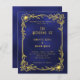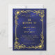 Para um casamento elegante, estilo Gatsby. Um fundo azul-marinho incolor decorado com uma estrutura de estilo deco de arte ouro com flores. Personalize e adicione seus nomes e detalhes. 1 folha = 1 convite impresso de borda a borda.