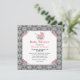 Convite de chá de fraldas em forma quadrada chic feito em uma cinza e cor damasco branca, com uma área de texto quadrado branco com um quadro decorativo cor-de-rosa. Gráficos doces de uma vintage que parece um bebê cor-de-rosa coral, decoram a parte superior da área de texto. Personalize o texto cor-de-rosa coral e a cinza do seu chá de fraldas. Os produtos correspondentes estão disponíveis.