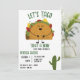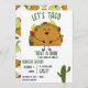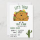 Taco de vamos de fiesta mexicano sobre um convite para Chás de fraldas de bebês. Com um taco grávida feliz e um cacto fofo na frente. E um padrão mexicano nas costas com taco, nacho, limão, cacto e pimentos coloridos. Design original.
