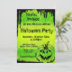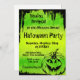 Convite de Halloween para uma festa de Halloween com abóbora em um fundo verde. Ande numa festa de Halloween para lembrar!