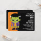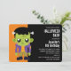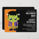Um convite de aniversário de Halloween com uma imagem divertida de Halloween, com um monstro verde de Frankenstein.