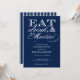 Este convite para jantar de ensaio sofisticado apresenta a frase "Coma, beba e case-se" em tipografia em negrito.