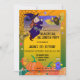 Um convite mágico para o Halloween, com uma bruxa com seu gatinho (assustado) voando sobre sua vassoura sobre um campo de abóbora com monstros fofos. Excelente para uma festa infantil.