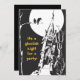 Uma imagem de casa assombrada, preta e branca, feita com lua de cheio, árvore nua e corvos é a característica na frente deste convite de festas de Halloween. O texto na frente diz "É uma noite fantasma para uma festa!" em laranja. O fundo preto sólido tem muito espaço para as informações da sua festa. Fácil de personalizar e, se você quiser alterar a fonte, o tamanho, o local ou a cor do texto, poderá fazer isso escolhendo "Personalizá-lo".