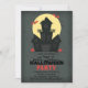 Eerie Haunted House Convite de festas apresentando uma casa assombrada com morcegos vermelhos e jack o'lanternas contra uma lua amarela clara.