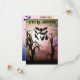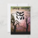 Um bando de morcegos voa através de uma floresta assombrada, com um pendurado em uma árvore, em um convite assustador de Halloween para uma festa adolescente. O dorso está em um gradiente de cor complementar, com textura, e um pequeno bando de morcegos voadores no canto superior esquerdo. O texto preto tem detalhes para a festa, com as informações de RSVP em cinzas claras para uma leitura fácil sobre o fundo mais escuro na parte inferior. Criado para combinar com os lençóis e guardanapos da festa da Floresta Assombrada.