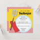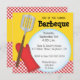 Este convite para churrascos de cor brilhante tem um fundo amarelo com uma faixa de cheques vermelhos na parte inferior. Uma luva vermelha e um gráfico de espátula estão no lado esquerdo com um grande círculo branco abrindo para o texto. Este convite pode ser personalizado para qualquer tipo de barbeque ou cookout.