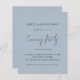 Um valor para o alternativo do ORÇAMENTO em tamanho menor de 4,5 x 5,6" de semirbrilho de 110 lbs, que é de espessura semelhante a um cartão postal (no entanto, não é adequado para uso como cartão postal). POR FAVOR, OBSERVE QUE HÁ UM convite por folha Orçamento Simples Dusty Blue Script, Convite para o Partido de Casamento da Noite. Defina elegância no estilo de escrita manual para o Partido da Noite e o resto do texto que você pode personalizar facilmente. As cores do texto e do plano de fundo podem ser alteradas para qualquer opção ou sua escolha por meio da opção personalizar mais.