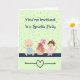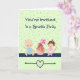Convite para um partido Sprinkle. A design tem dois bebês ilustrados, um menino e uma menina sentados ao lado de um grande Bolo de Taça com aspersores adicionados ao fundo. Há também um coração com aspersores no centro. A festa é como um chá de fraldas, mas é para um segundo filho.