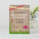 Este convite para piquenique com sorte apresenta um design rústico. Bandejas de bandeira vermelha e amarela, grama e melancia destacam o fundo da madeira.