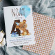 Este quarto convite de festa de aniversário apresenta um ursinho de pelúcia com chapéu de festa azul. A parte de trás do convite tem um padrão marrom de gingham; perfeito para a festa de aniversário do 4º aniversário da floresta de menino. Personalize o convite com seus detalhes e você tem as opções para comprar convites impressos ou um download digital.