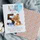 Este convite para a quinta festa de aniversário apresenta um ursinho de pelúcia com chapéu de festa azul. A parte de trás do convite tem um padrão de gingham castanho; perfeito para a festa de aniversário 5 temática de animais de floresta masculina. Personalize o convite com seus detalhes e você tem as opções para comprar convites impressos ou um download digital.