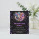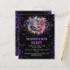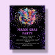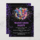 Convite personalizável do partido Mardi Gras. Apresentando uma máscara de mascarada Mardi Gras colorida e impressão de brilho falso em um fundo preto.