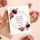 Na frente: Um convite para uma festa de aniversário elegante. Um fundo branco chic com uma falsa estrutura geométrica dourada. Decorados com flores, rosas e penas de tipo vassoura, escuras e cor-de-rosa, de cor-d'água. Modelos para um nome e detalhes da festa. O nome é escrito com um estilo escrito à mão, letras coloridas burgundy. Fundo: fundo branco colorido.