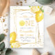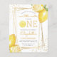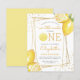 Esse primeiro convite de aniversário de limonada com o tema dos citros apresenta um quadro geométrico dourado adornado com limões de aquarelas. A palavra "UM" aparece em letras amarelas maiúsculas com uma fatia de limão de aquarela em vez de "O". Adicione seu nome de docinho e aniversário em um guião amarelo moderno e os detalhes da festa em cinzas de carvão serif. A parte traseira da placa é amarelo sólido. Um tema ideal para uma festa de aniversário de verão!
