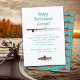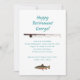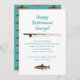 Convite de festas de aposentadoria de pesca. Capturar imagens de peixes e rodas e rochas decoram papel branco com texto azul marinho. Personalize com letras grandes no topo dizendo, "Feliz aposentadoria (nome)" e use a modelo de parágrafo abaixo para adicionar tantas informações quanto você gostaria de incluir. Uma imagem de barra e rolo separa o texto e uma imagem de truta é impressa na parte inferior Adicionar espaços onde for necessário para ajustado do texto da sua parte. O reverso é azul-oceano com um padrão de truta mariscada nadando. Perfeito para o homem que sonha pescar muito na aposentadoria!