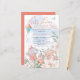 Um tamanho maior de 5,5" x 8,5" a um preço orçamentário, em um STOCK CARD SEMI GLOSS de 110 lb, excelente de convites, aproximadamente na mesma espessura de um cartão postal, ou um estoque LINEN elegante de 110 lb - para um luxo, ligeiramente mais fino, com um valor de excelente. Este alternativo de tamanho de orçamento também está disponível em outras opções de papel. O papel FELT de 100 lbs é colorido por buff, NÃO branco, então adiciona um toque rústico. O estoque de papel MATTE de 80 lb é branco brilhante, para impressão nítida, excelente para seus menus e programas, enquanto o papel SATIN de 80 lb é fino e leve, ideal para gabinetes. OBSERVE QUE OS ENVELOPES OPCIONAIS SÃO UM POUCO MAIORES EM TAMANHO A 6,75" x 9" APROXIMADAMENTE. Chá de fraldas Pic. Colocando a cena para seu piquenique com este elefante fofo com sua cesta, xícara e bolo, com flores lindas e pipa voadora. O Chá de fraldas de cabeçalho está em um script elegante definido e o resto do texto que você pode personalizar facilmente. Um fundo de coral coordenado está atrás.