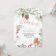 Feliz Pequeno convite Chá de fraldas com o tema tradicional da natureza no inverno e a caligrafia elegante. A design neutra em termos de gênero apresenta uma aquarela, pinheiros, galhos de Natal, verde, bagas de inverno e pinheiros. O chá de fraldas é escrito em tipografia manuscrita e o modelo está pronto para você adicionar os detalhes do convite do chá.