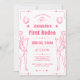 Adorável convite da primeira festa de aniversário de uma garota no tema ocidental, com cores rosa e brancas.