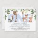 Folhagem Woodland Animal primeiro aniversario Convite Convite para a realização de um convite para o primeiro aniversário, lançado em primeira mão por um rapaz de raça branca, com a palavra "um em negrito" em azul-bebê e cinco animais de floresta giros. O design também apresenta uma adorável folhagem de aquarela.
