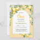 Convite para primeiros aniversarios de citrinos limões, desenhados em cores pastéis moles no estilo aquarela.
