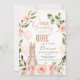 Primeiro aniversario de coelho florido cor-de-rosa Convite para coelho doce Alguns coelhos estão fazendo um primeiro convite de aniversário com um coelho coelho vestindo uma jaqueta rosa e uma coroa floral. O design também apresenta algumas imagens de texto falíveis douradas que são removíveis. Este é um doce design para um coelhinho ou coelho das meninas, tema da primeira festa de aniversário.