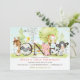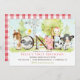 Convite para primeiros aniversarios com tema fazenda que inclua animais de exploração. A parte de trás do convite tem um padrão de gingham vermelho.