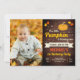 Incêndios para seus convidados com esta festa de primeiro aniversario fofa convidando com uma adorável abóbora com elementos vibrantes contra um fundo de madeira rústica. Basta adicionar os detalhes do seu evento neste modelo fácil de usar e adorar este cartão com a foto favorita do seu filho para torná-lo um convite generoso. Sacudir a placa para revelar um padrão elegante de gingham laranja na parte traseira da placa.