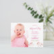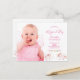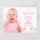Na frente: Um convite de festas primeiro aniversario para uma menina. Dois unicórnios bonitos em branco e rosa com estrelas e bandeiras de bunting. Fundo branco. Insira sua foto da aniversariante! Modelos para nome, idade e detalhes da festa. Com o texto: Dia Mágico escrito com uma escrita de estilo moderna, escrita à mão. Letras cor-de-rosa.