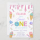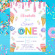 Adorável doce convite de primeiro aniversário para a garota. Sorvete bonito com aspersores em pias cor-de-rosa, lavanda, púrpura e sorvete derretido.