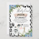 Meninos Santa Vaca e primeiro aniversario de Vaca Convite à Impressão Vaca Cuta Recebeu o primeiro convite de aniversário para um bebê. O primeiro design de convite de aniversário deste rapaz apresenta uma vaca branca e negra, um padrão de impressão de vaca ousado e algumas lindas flores azuis. Este design também apresenta um brilho dourado falso amovível na frente e no verso do convite. Este convite é uma maneira fofa de convidar convidados para a primeira festa de aniversário de um menino temático de vaca.
