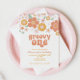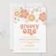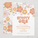 Retro inspirou Groovy Um primeiro convite de aniversário com flores do estilo 70 e fontes e cores boho.