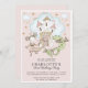 Um reino mágico do castelo aquoso com princesa e dragão, convite de festas de primeiro aniversario de menina com uma fronteira branca. Whimsical, mágico e fofo, para uma criança.